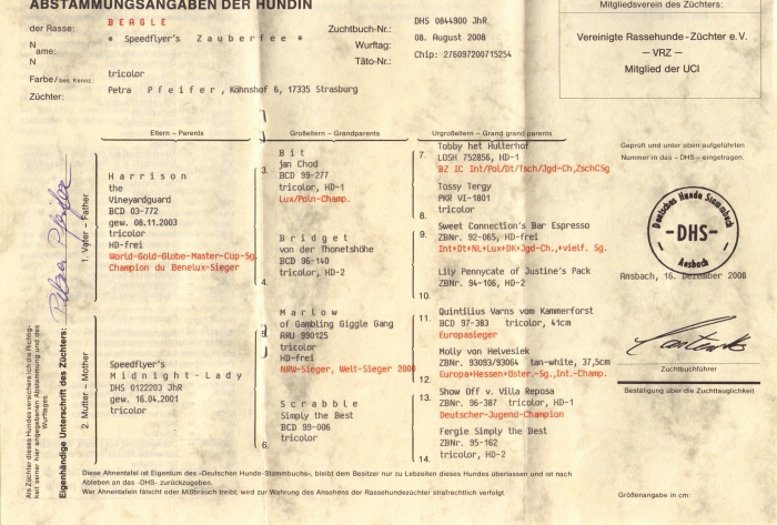 Abstammungsurkunde von "Lotte" Speedflyers Zauberfee